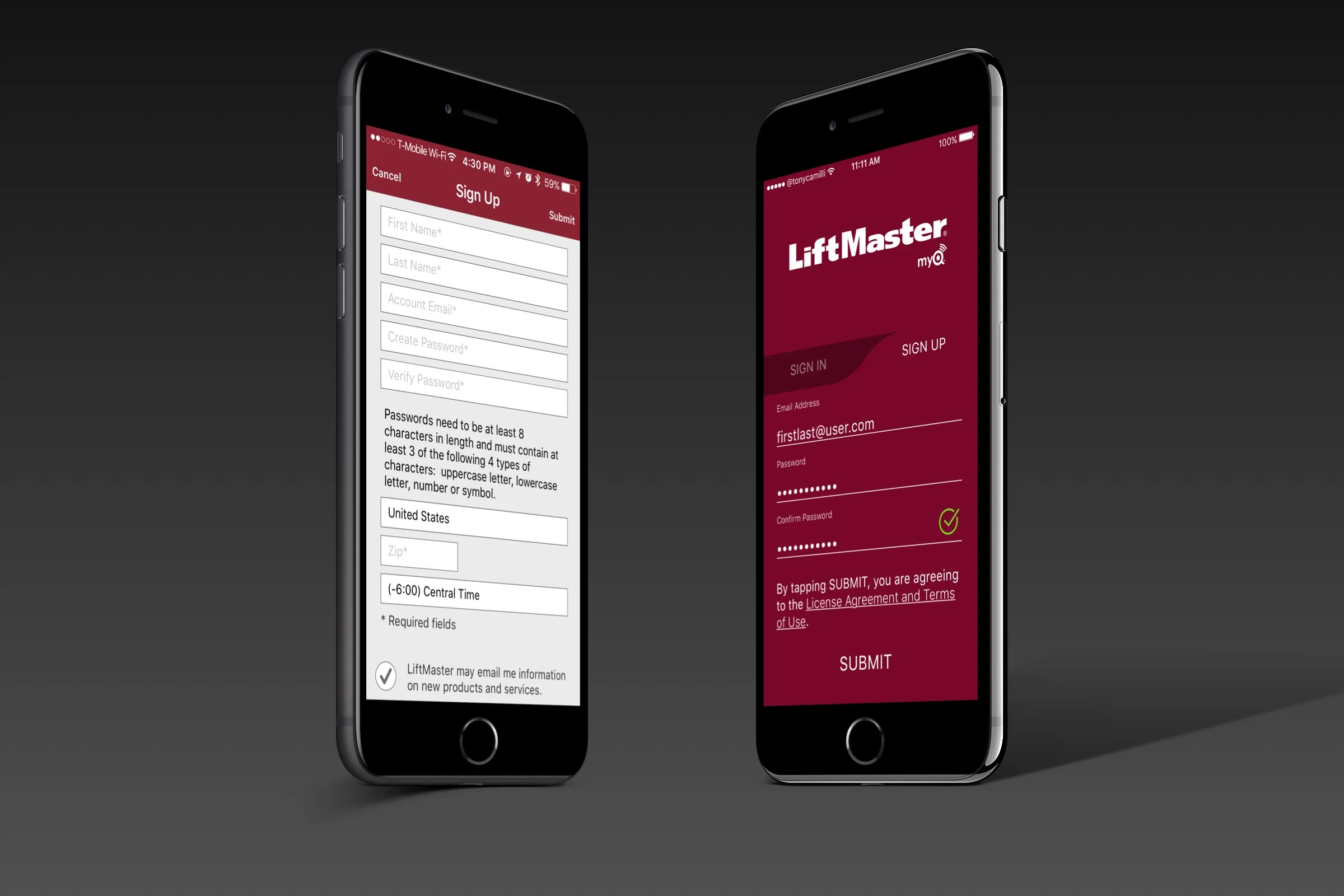 Finally for the "sign up" link. Typical signup for MyQ is on the web when you are setting up a myQ device. However, rather than removing this from the app, I made it an alternate tab on the login experience. I can foresee a user wanting to set this up entirely in the garage while installing their myQ garage door opener. The sign-up screen will be my next project.